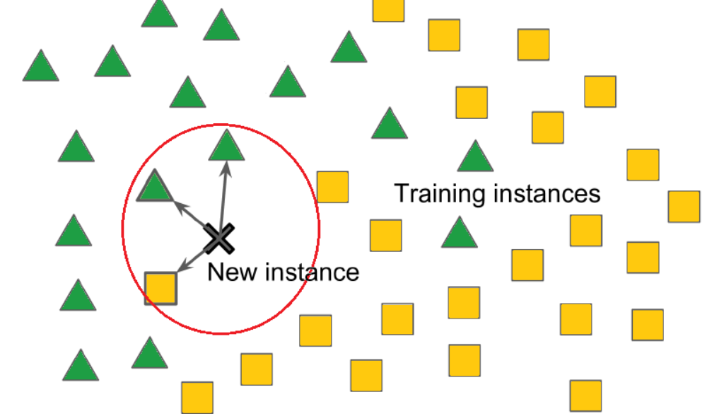 from sklearn.neighbors import KNeighborsClassifierimport numpy as np# Prepare the dataX = df[['X1', 'X2']].valuesy = df['y'].values# Create and train the k-NN classifierknn = KNeighborsClassifier(n_neighbors=3)knn.fit(X, y)
