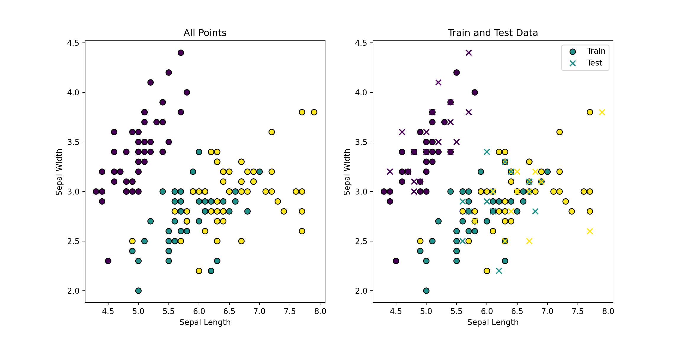 from sklearn.datasets import load_irisfrom sklearn.model_selection import train_test_splitfrom sklearn.neighbors import KNeighborsClassifierimport numpy as npimport matplotlib.pyplot as plt# Load the iris datasetiris = load_iris()X = iris.data[:, :2] # Use only the first two featuresy = iris.target# Split the dataset into training and testing setsX_train, X_test, y_train, y_test = train_test_split(X, y, test_size=0.3, random_state=42)# Plot all pointsplt.figure(figsize=(12, 6))plt.subplot(1, 2, 1)plt.scatter(X[:, 0], X[:, 1], c=y, cmap='viridis', edgecolor='k', s=50)plt.title('All Points')plt.xlabel('Sepal Length')plt.ylabel('Sepal Width')# Plot train and test data separatelyplt.subplot(1, 2, 2)plt.scatter(X_train[:, 0], X_train[:, 1], c=y_train, cmap='viridis', edgecolor='k', s=50, label='Train')plt.scatter(X_test[:, 0], X_test[:, 1], c=y_test, cmap='viridis', edgecolor='k', s=50, label='Test', marker='x')plt.title('Train and Test Data')plt.xlabel('Sepal Length')plt.ylabel('Sepal Width')plt.legend()plt.show()