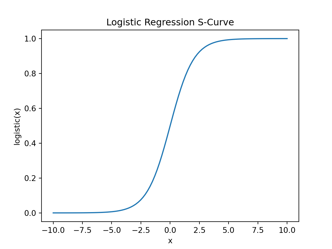 The logistic function (S-curve) maps any real-valued number into the range [0, 1].