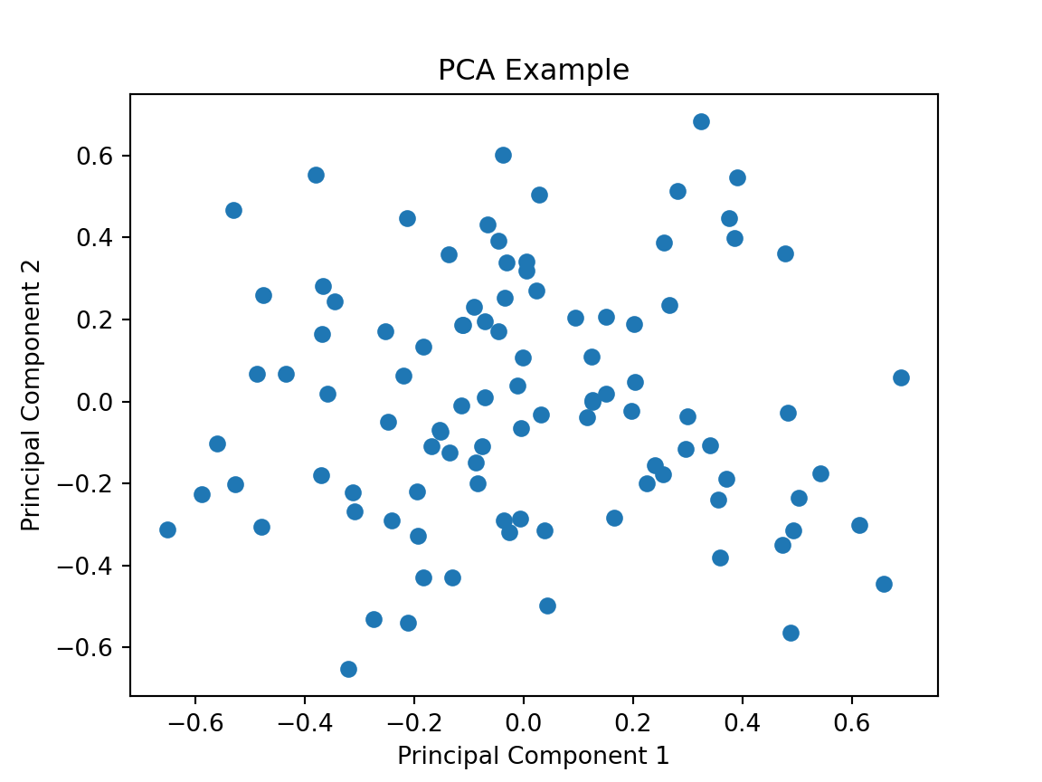 from sklearn.decomposition import PCAimport numpy as npimport matplotlib.pyplot as plt# Generate some sample dataX = np.random.rand(100, 5)# Create and train the PCA modelpca = PCA(n_components=2)X_pca = pca.fit_transform(X)# Plot the PCA-transformed dataplt.scatter(X_pca[:, 0], X_pca[:, 1])plt.title('PCA Example')plt.xlabel('Principal Component 1')plt.ylabel('Principal Component 2')plt.show()