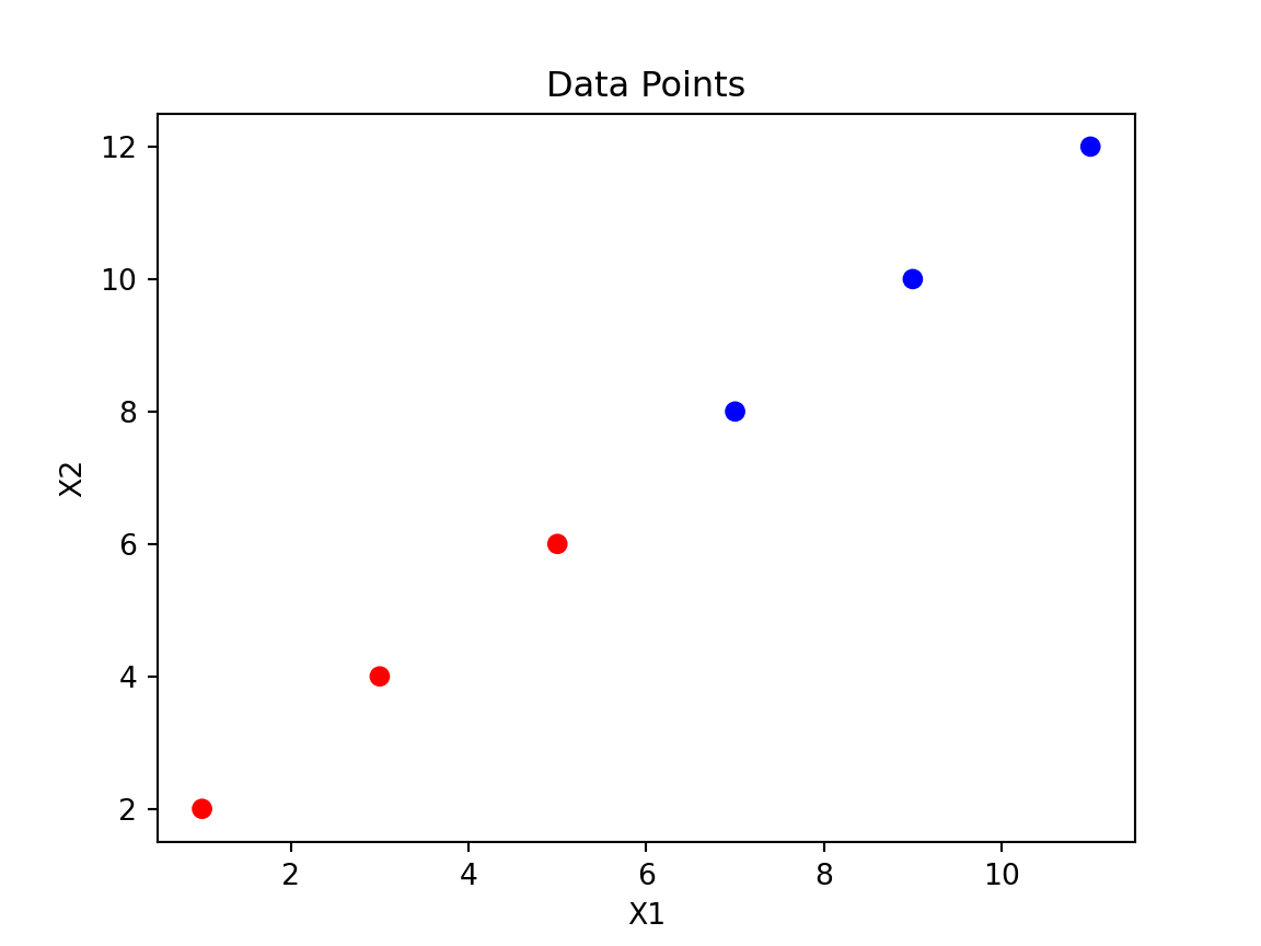 import pandas as pd# Create a DataFrame with six varied data pointsdata = {'X1': [1, 3, 5, 7, 9, 11],'X2': [2, 4, 6, 8, 10, 12],'y': ['red', 'red', 'red', 'blue', 'blue', 'blue']}df = pd.DataFrame(data)# Map 'red' to 0 and 'blue' to 1color_map = {'red': 0, 'blue': 1}df['y'] = df['y'].map(color_map)