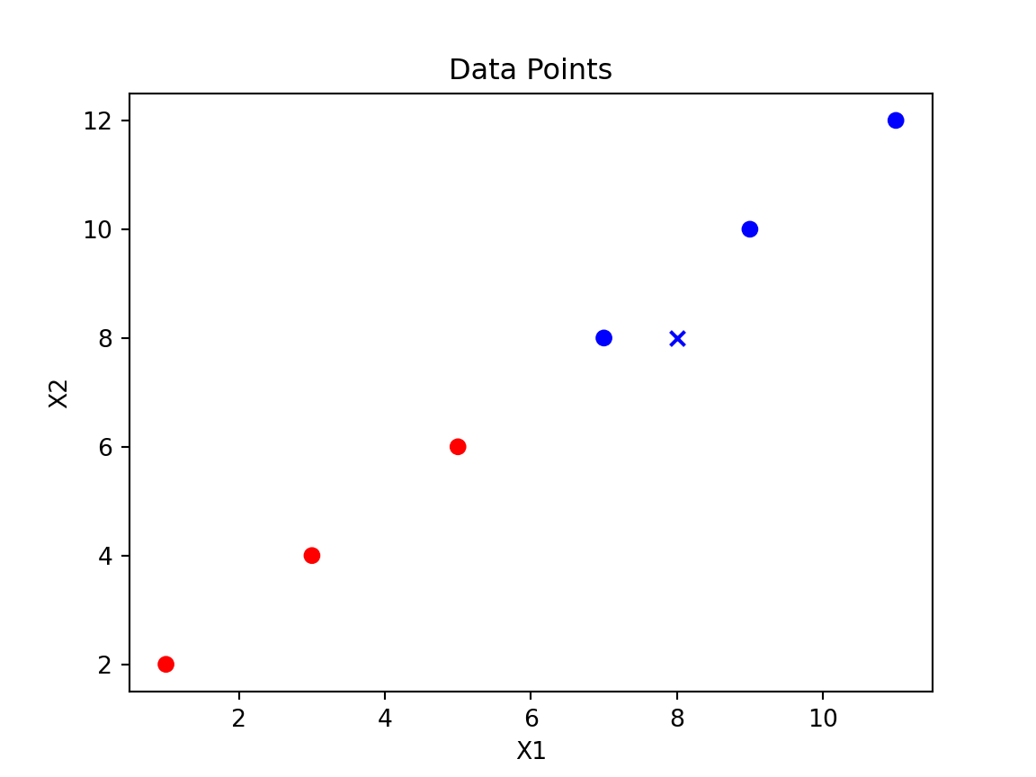 # Predict the class of a new pointnew_point = np.array([[8, 8]])predicted_class = knn.predict(new_point)predicted_color ='red'if predicted_class ==0else'blue'print(f'The new point {new_point} is classified as {predicted_color}.')
